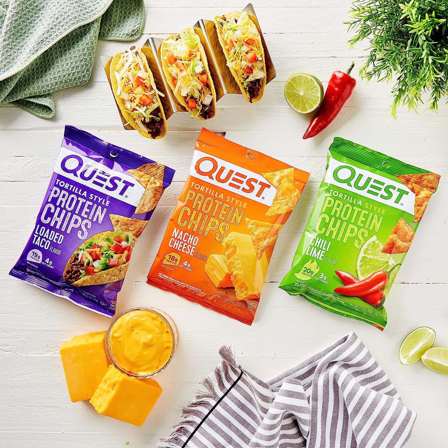 • CHIPS THAT TRAVEL WITH YOU: Take Quest Tortilla Style Protein Chips with you in your backpack, purse, car console, gym bag or wherever your adventures take you. Variety pack contains 12 Quest Tortilla Style Protein Chips (4 Chili Lime flavor, 4 Nacho Cheese flavor, 4 Loaded Taco flavor)